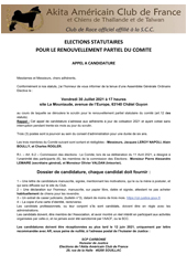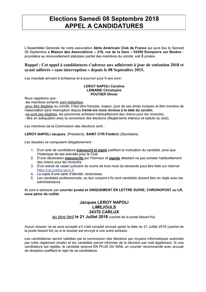 Elections du renouvellement statutaire partiel des membres du comité, le samedi 8 septembre 2018, lors de l'Assemblée Générale à Dompierre sur Bresbre. APPEL A CANDIDATURES jusqu'au 21 juillet 2018 au plus tard, selon les modalités suivantes :