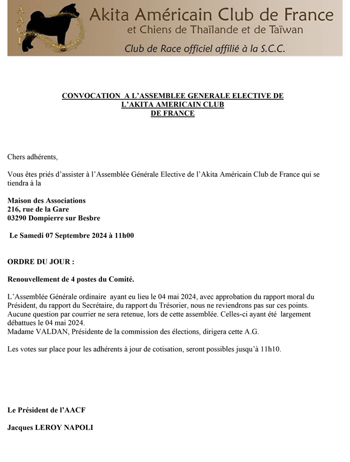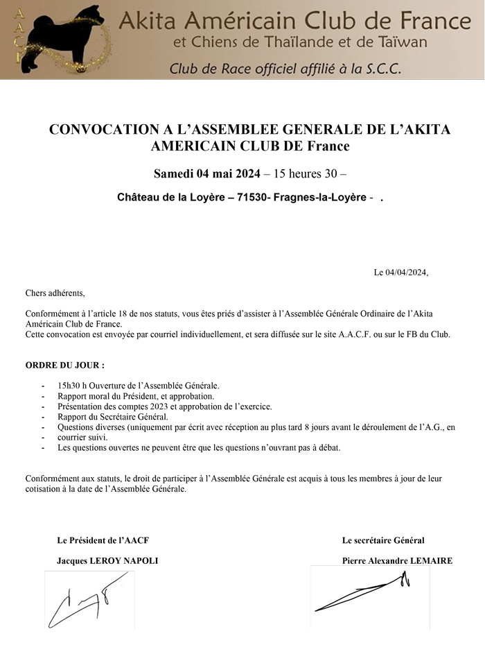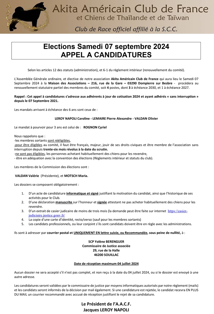 L’AACF a procédé à son Assemblée Générale Ordinaire, le 4 mai 2024, à Chalon sur Saône. Il était prévu qu’elle soit suivie de l’AG élective à 17h30. Toutefois, par suite d’un constat de M. Fabrice Roux, adhérent de l’AACF, qui a soulevé une erreur de délai de notre part, (274 jours, au lieu de 365 jours de délai entre une cooptation et un scrutin) (Cooptation de Mme Valérie Valdan, entérinée à l’AG du 4/08/23), nous avons été dans l’obligation d’annuler l’AG élective. L’ensemble des bulletins de vote, lettres de candidatures et rapport d’huissier a été détruit immédiatement par la scrutatrice désignée, Mme Paula De Matos Martins. Ces élections seront donc reportées à une date ultérieure, qui bien évidemment sera après les 365 jours nécessaires. Nous vous informerons très rapidement à ce sujet.