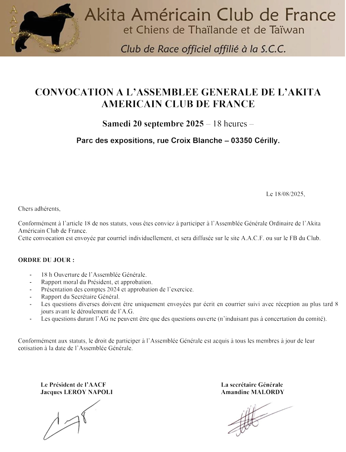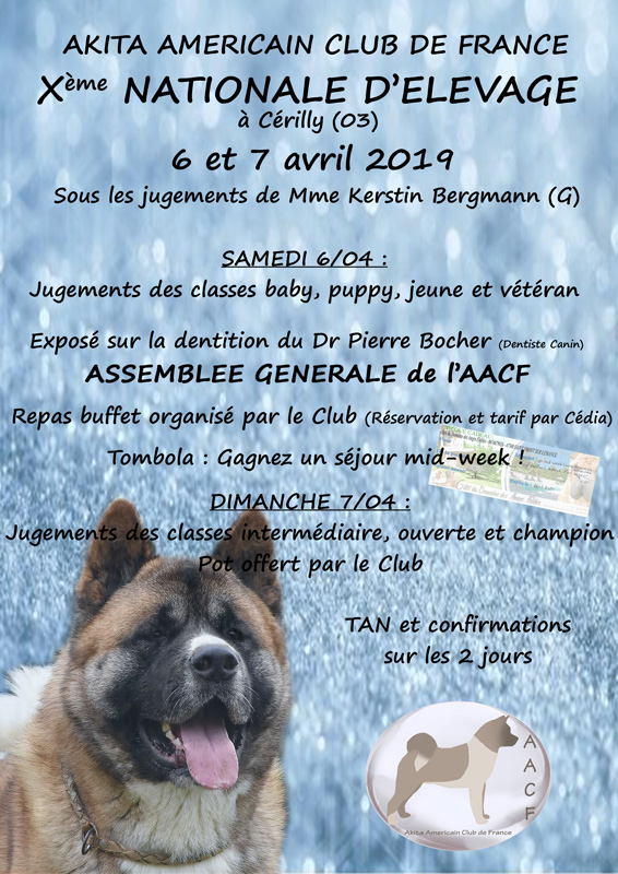 Le Président de l’AACF, Jacques LEROY NAPOLI ainsi que l’ensemble du Comité tiennent à remercier toutes les personnes ayant contribué à la réussite de cette 10ème Nationale d’Elevage. Nous remercions tout particulièrement notre juge, Mme Kerstin Bergmann qui a pris soin d’observer et juger avec tact, nos Akitas Américain pendant 2 jours, ainsi que l’équipe qui l’entourait, Mme Françoise Lecomte, Secrétaire de ring, Mme Lucie Brunier, commissaire de ring, Mme Chantal Godimus qui a pu faire un assessorat, et Mlle Aleksandra Dumottay qui a immortalisé ces 2 jours par ses photos. Nous remercions tous les participants venus célébrer ce 10ème anniversaire ensemble. Bravo aux nombreux volontaires venus aider à l’installation ainsi qu’au nettoyage et rangement. Le nouveau TAN a été testé par nos examinateurs Linda Deconinck, Pierre Alexandre Lemaire, Amandine Malordy et Valérie Valdan.