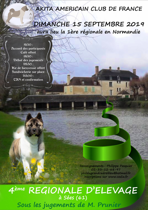 Le Club tient a remercier et a féliciter toutes les personnes qui ont contribué à la réussite de la 1ère Régionale d’Elevage en Normandie organisée par Monsieur Philippe Pasquier et son équipe de bénévoles. Sous un beau soleil, les 25 chiens inscrits ont été jugés et départagés par Monsieur Eric Prunier, qui nous a livré ses impressions, interviewé par Pierre Alexandre Lemaire, représentant l’AACF durant cette sympathique journée. Nous félicitons Madame Sandrine Crochet propriétaire de la gagnante du Meilleur de Race avec sa femelle “Sendosan Once Upon a Time Mango”. Madame Jessica Fraiz avec “Sendosan Naxxramas”, Meilleur mâle de la journée. Le Meilleur baby, appartenant à Monsieur Pierre Alexandre Lemaire : “P’Akita of Iron Duck”. Le Meilleur Puppy, “Pearl du Grand Cèdre Bleu” à Monsieur Philippe Pasquier. Le Meilleur Jeune : “Redient Zeitgeist” à Madame Jessica Fraiz. Le Meilleur Champion : “Infernal Warrior Mya” à Monsieur Philippe Pasquier. Et le Meilleur Vétéran : “Loudou’s Getting My Happy Back” appartenant à Madame Patricia Geerts Laydier. Nous remercions également les nombreux cadeaux et récompenses offerts par Monsieur Pasquier et les sponsors Profusion, Cavalor, Versele-Laga, et le Grand cèdre Bleu Magasin.