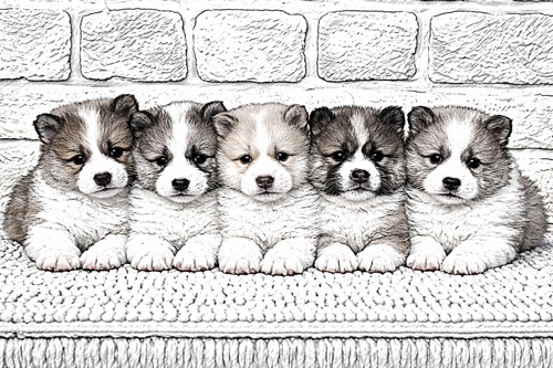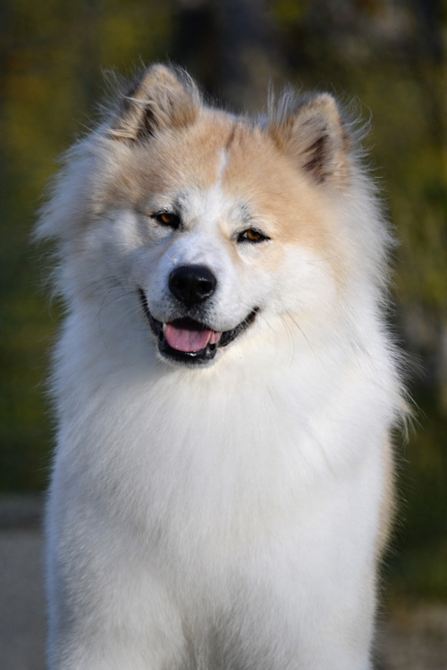 Son poil double et dense forme une impressionnante crinière autour du cou, donnant à son port une majesté naturelle. Cette collerette, particulièrement marquée chez les mâles, évoque celle d’un lion ou d’un renard des forêts d’Asie. Les robes sont blanches tachées de fauve, citron, rouge, fauve, feu ou grise avec ou sans les extrémités charbonnées, même au point d’apparaître tricolore, et blanche avec des plages de noir solide. Son regard, vif et pénétrant, exprime une intelligence rare et une curiosité constante.
