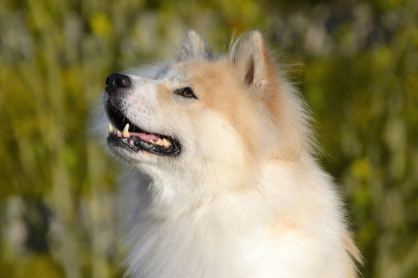 Son poil double et dense forme une impressionnante crinière autour du cou, donnant à son port une majesté naturelle. Cette collerette, particulièrement marquée chez les mâles, évoque celle d’un lion ou d’un renard des forêts d’Asie. Les robes sont blanches tachées de fauve, citron, rouge, fauve, feu ou grise avec ou sans les extrémités charbonnées, même au point d’apparaître tricolore, et blanche avec des plages de noir solide. Son regard, vif et pénétrant, exprime une intelligence rare et une curiosité constante.