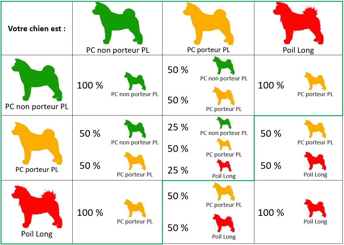 L'Akita Américain poil court peut être porteur du gène poil long. Ce gène est à transmission Autosomique récessive, ce qui signifie que le caractère héréditaire doit être transmis par le père et la mère pour se manifester. Le poil long est causé par des mutations du gène du facteur de croissance des fibroblastes-5 (FGF5). Le test du poils long chez l'akita identifie la mutation c.578C>T. L'allèle du poil court est dominant sur le poil long, donc deux copies de l'allèle du poil long sont nécessaires pour avoir des chiens à poil long. Si vous voulez savoir si votre Akita Américain est porteur du gène poil long, cliquez sur le lien suivant pour connaitre les laboratoires qui pratiquent ce test : https://www.club-aacf.fr/genePL.html